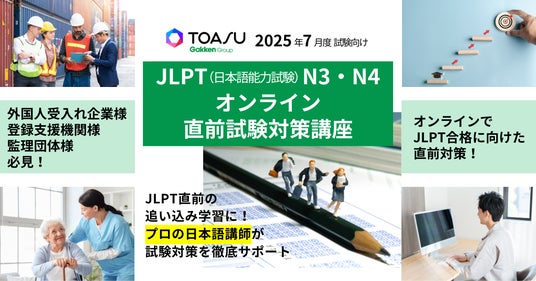 株式会社 学研ホールディングス(東京・品川/代表取締役社長 宮原博昭)のグループ会社、株式会社TOASU(東京・品川/代表取締役社長:宮田晃)は、2025年7月JLPT(日本語能力試験)N3・N4合格に向けた直前対策講座の提供を開始いたしました。