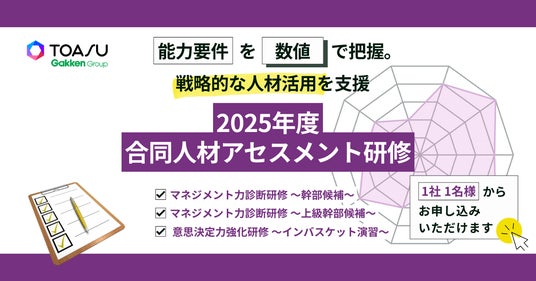 株式会社 学研ホールディングス(東京・品川/代表取締役社長:宮原博昭)のグループ会社、株式会社TOASU(東京・品川/代表取締役社長:宮田 晃)は、2025年度合同人材アセスメント研修「マネジメント力診断研修~ 上級幹部候補~」「マネジメント力診断研修~ 幹部候補~」「意思決定力強化研修~ インバスケット演習~」の3コースを提供開始いたします。