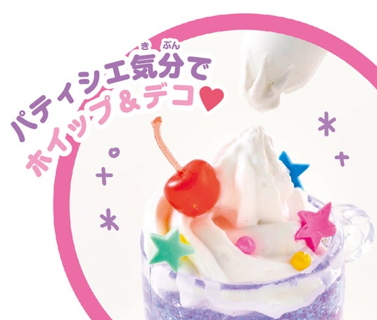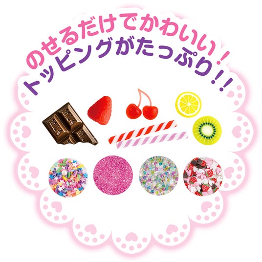 キットには、キラキラをプラスするピンクラメやホログラム、トッピングするだけでかわいくなるフルーツやチョコ、ストローなどのデコパーツ、ハートや星などの小さなフレークもたっぷり入っています。かわいく盛れるようにミルキーホイップにもこだわりました。デコパーツやねんどの組み合わせしだいでアレンジも無限大! 自由に盛り付けて、世界にひとつだけのスイーツがつくれます。