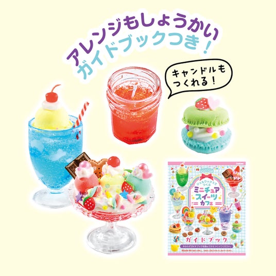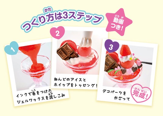 ガイドブックには、デコの手法を変えるアレンジ例、あまったジェルワックスでつくるキャンドルや、ねんどとホイップだけでつくれるスイーツなども紹介しています。ジェルワックスはキャンドルの素材なので、好きな色をつけてガラスビンに入れればキャンドルとして楽しむこともできます。本キットのミニチュアスイーツは水平なところに置けば、そのまま長く保存することができるので、お子さまの夏休みの工作の宿題にもおすすめです。