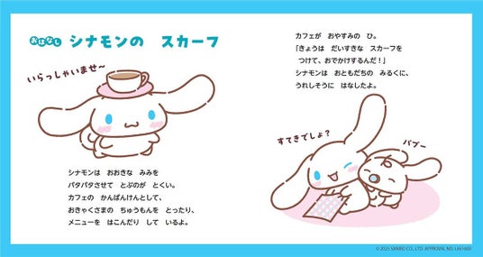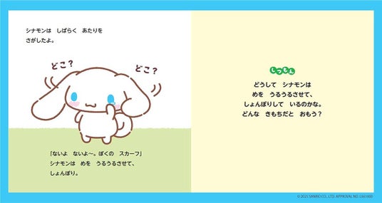 【おはなし】……気持ちを知るための物語です。あるお休みの日、シナモンはお出かけ先で大好きなスカーフをなくしてしまうという「かなしい」出来事に見舞われます。お子さまは、シナモロールと一緒に気持ちについて考え、気持ちと上手に付き合うことの大切さを知ります。