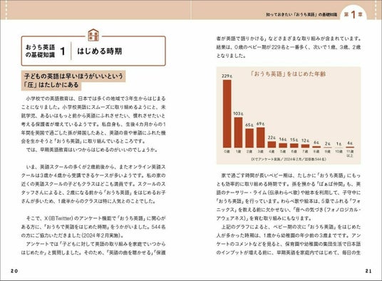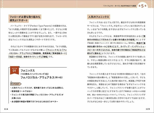 取り上げるメソッドは、『読み聞かせ』『フォニックス』『かけ流し』など。それぞれ具体的な実践方法やおすすめのポイント、注意すべき問題点などを詳しく解説します。また、実際に「おうち英語」に取り組んでいる保護者へのインタビューやアンケートを通じて、リアルな体験談も紹介しています。