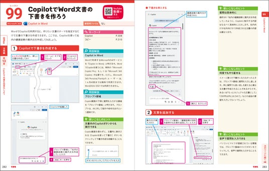 Microsoft 365に搭載されたAI機能「Copilot」の活用方法をアプリごとに具体的に解説します。文書の要約や表のデータ分析、テーマに沿ったスライド作成など、これまで時間のかかっていた作業も劇的に短縮できます。また本書ではWebブラウザーから操作する無料版Copilotの操作方法と実用例も紹介。PowerPointのスライドに挿入するイラストを作成したり、Excel関数のエラーの原因を調べたりする方法を解説しています。本書を参考にCopilotを活用すれば、日々の業務をよりスマートに進められます。