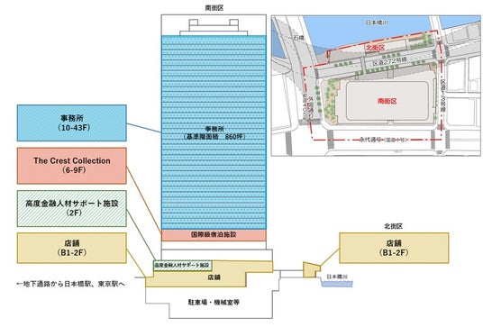 再開発区域内の南北街区を一体整備し、南街区は基準階面積約860坪を有するオフィスを中心とする高層棟を、北街区は首都高の地下化に伴い整備される日本橋川沿いの水辺空間と、水辺空間に連続する低層の商業施設をそれぞれ配置し、南北街区間に設ける歩行者デッキからのスムーズな歩行者動線を確保します。また、南街区では日本橋駅と東京駅を地下通路でつなぎ、日本橋駅・大手町駅・東京駅・京橋駅間の広域地下歩行者ネットワークを実現します。