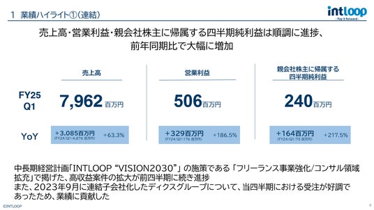 売上高7,962 百万円(前年同期比+63.3%)、営業利益506百万円(前年同期比+186.5%)となり、順調に進捗し、 過去最高となりました。背景として、2024年9月13日に発表した中長期経営計画「INTLOOP “VISION2030”」の施策、 「フリーランス事業強化/コンサル領域拡充」で掲げた高収益案件の獲得が、前四半期に引き続き進捗したことが挙げられます。これにより、前年同期及び前四半期と比較して、粗利率が改善しました。また、2023年9月に連結子会社化したディクスグループについて、当四半期における受注が好調であったため、業績に貢献しました。