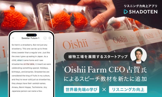 英語学習プラットフォームの株式会社プログリット(本社:東京都千代田区有楽町、代表取締役社長:岡田 祥吾、証券コード:9560)が提供する、リスニング力を向上させるサブスク型英語学習サービス「シャドテン」は、新教材として、植物工場を展開するOishii Farm CEO 古賀大貴氏がTEDで行ったスピーチ「The Sweet Future of Vertical Farming(植物工場の『おいしい』未来)」を追加いたしました。本スピーチは、日本人史上4人目となる本家TEDステージでの登壇として大きな注目を集めたもので、古賀氏が植物工場や農業の未来について紹介しています。今回シャドテンに加わることで、世界最先端の農業ビジネスの知見に触れながら、リスニング力アップに向けた英語学習に取り組むことができます。