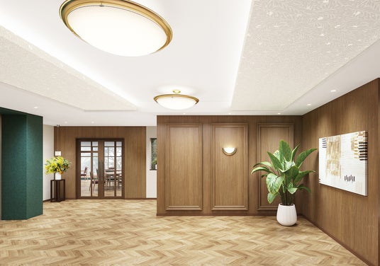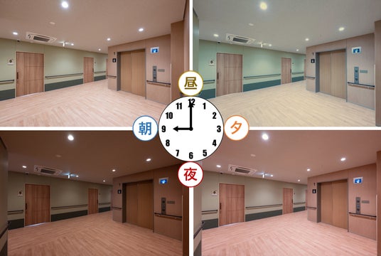 ・「調光調色照明システム」の導入により、時間帯に応じて、照明を自動調整。館内にいながらも自然な光を演出することができ、身体のリズムを整えて入居者様の健康維持をサポートします。