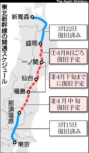 ・ 東北新幹線は4月下旬までに全線復旧予定(2011年3月28日21時3分報道)