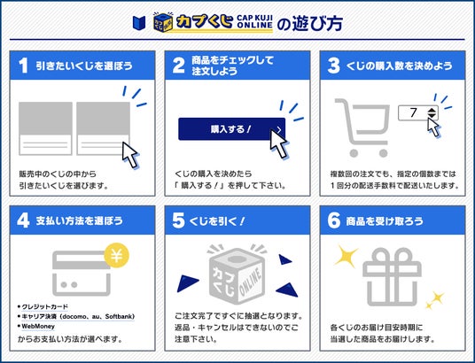 「カプくじオンライン」は、スマホ・PC等のWEBサイトからご利用いただける、「手軽に」「ハズレ無しで」「特別な商品が」「ご自宅まで直接届く」ハズレ無しのオンラインくじサービスです! カプコン限定の商品やオリジナルグッズなど、様々な企画をお届けいたします!