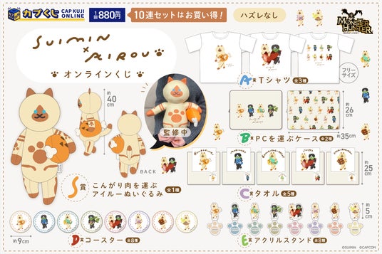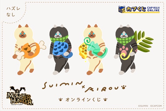 株式会社カプコンが運営するオンラインくじサービス「カプくじオンライン」(以下、「カプくじ」)にて、ゆるくて可愛いらしい「運ぶねこ」シリーズで人気のクリエイター、SUIMINさんによる描き下ろしイラストを使用した、「SUIMIN×アイルー」のオリジナル商品を販売いたします。