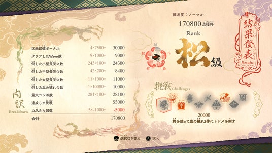 ハイスコアを目指すには「一夜でも多く世代を護り、生き残ること」はもちろんですが、「コンボを繋げる」、「どのような敵を倒したか?」や、多種の要素も加味されてトータルのスコアが算出されます。