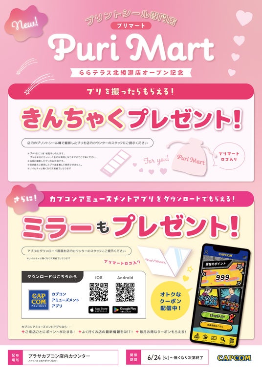 株式会社カプコンは、2025年6月24日(火)にグランドオープンする新たな商業施設「三井ショッピングパーク ららテラス北綾瀬」にて、アミューズメント店舗「プラサカプコン」、プリントシール(以下、プリ)機専門店「Puri Mart(プリマート)」と、カプセルトイ専門店「カプセルラボ」をオープンさせることを発表いたしました。