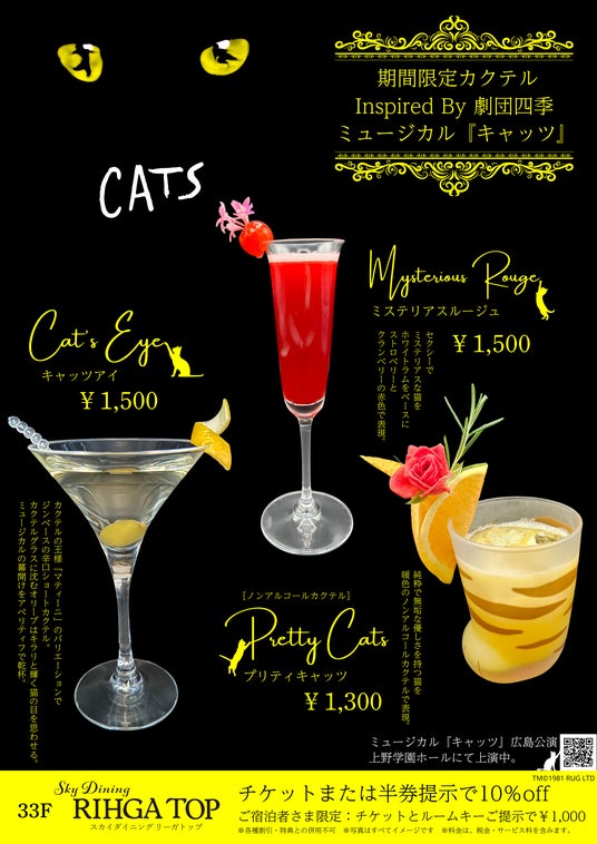 リーガロイヤルホテル広島(広島市中区基町 / 総支配人 室敏幸)は、1983年11月11日の日本初演以来、多くの人々を惹きつけ、12年ぶりに広島・上野学園ホールで公演中の劇団四季ミュージカル『キャッツ』とのコラボレーション第1弾として、最上階・33階の「スカイダイニング リーガトップ」にて、カクテル3種を2024年12月23日(月)~2025年2月28日(金)までの期間限定で販売します。また、チケット(半券含む)をお持ちのお客様には、館内直営レストランの割引優待を実施いたします。