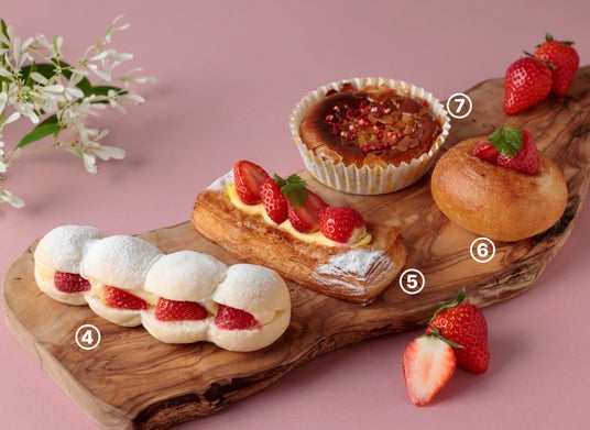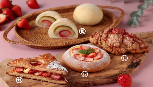 いちごを使ったパンは、サクサクのデニッシュ生地にカスタードクリームを絞りいちごをのせた「ロイヤルストロベリーデニッシュ」や、ミルククリームといちごのコンポートを入れてひと口サイズにちぎって食べやすく仕上げた「いちごと練乳のちぎりパン」など、全8種が登場します。