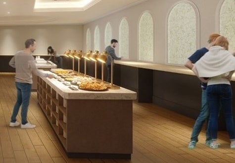 宿泊予約サイトで高評価をいただいている「ジョージタウン」の朝食は、ご宿泊以外のお客様のご利用も多く、料理台の混雑緩和は長年の課題でした。今回の改装では、ビュッフェエリアと客席エリアに区分けし、さらに料理コーナーをアイランド式に配置して両サイドからお料理を取れるようにすることで、スムーズな動線を確保しております。