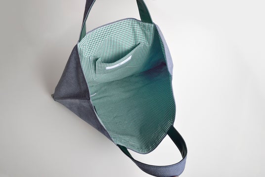 デニムバッグ下部の皮革部分と裏地のチェック色は、ホテルのブランドカラーである豊かな自然をイメージするグリーンを使用しているのもポイントです。