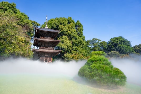 庭園のシンボルである 三重塔「圓通閣(えんつうかく)」は、1925年に東広島・篁山竹林寺より移築され、2025年に100周年を迎えます。室町時代前期の部材が使用されているこの三重塔は、都内に現存する三古塔の一つで、国の登録有形文化財に登録されています。