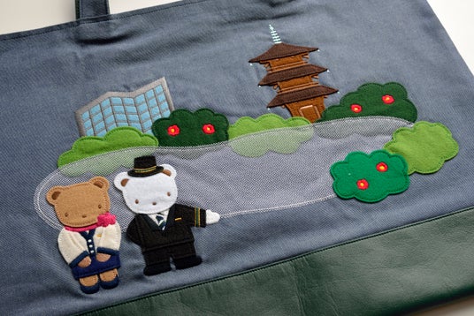 三重塔や椿、東京雲海などホテルの象徴の庭園や、ホテルスタッフの制服を着たクマちゃんを描いたコラボレーションならではのデザイン。フェルトアップリケのクマちゃんやラメ糸の入ったチュールで表現した東京雲海など、表情豊かなデザインがポイントです。
