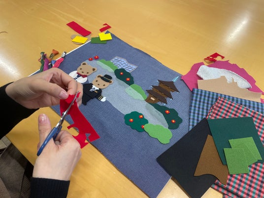 アート制作はすべて手仕事で行っています。実際にバッグの大きさにカットした平デニムの生地の上に、フェルトや生地をモチーフの形にカットして置いていきます。この工程は「色置き」と呼ばれ、創業当時から続くファミリアならではの手法です。実際の生地を使って置くことで、仕上がりのイメージが掴みやすくなり、温かみのあるアートが仕上がります。