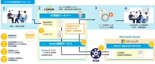 生成AIを利用した自動要約は、マイクロソフト社のAzure OpenAI Serviceを利用しており、会話内容をAI側の学習に利用せずに要約します。LGWANからAzure OpenAI Serviceに向けての通信はLGWAN-ASPの閉域接続サービスを活用しており、外部ネットワークを経由することなく安心して利用できます(図3)。また、生成AIに会話内容を送付する前に個人が特定されるような情報を自動マスキングするため、より安心してデータを扱うことができます。