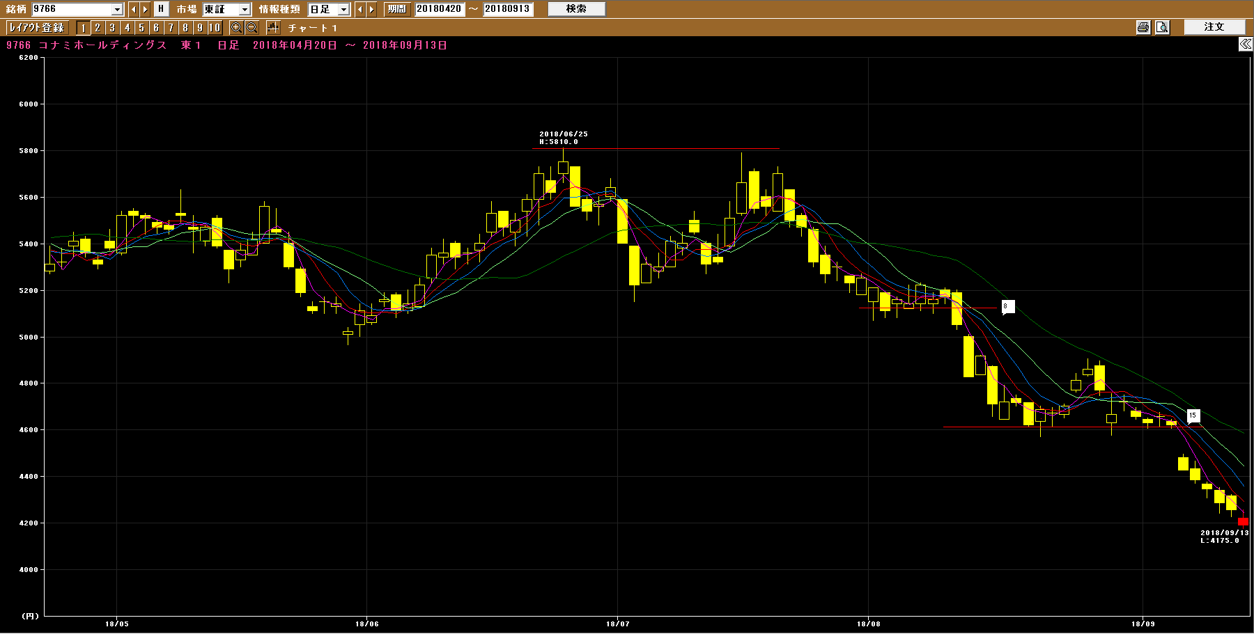 天井の6500円から下げて、もみ合い約半年。少し戻しましたが、再びWトップで前の高値を超えられず下げてきました。500円くらい下げると横ばいますが、再び大きく下げ、ちょい上げしましたが、再び下げています。これだけ下げてくると、流石に損切が後を絶ちません。また、下で買って儲かってる人も心穏やかではなく、当然利確の売りが湧いてきます。4000円くらいでまた、横ばうかもしれませんが、戻り売りは後を絶たないと思います。