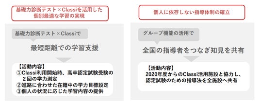 これらの課題解決に向け、少年等の個々人にあわせた個別最適な学びの提供と、各施設の指導者の指導方法向上を支援するために、全国の少年院(29 庁対象/2024年11月現在)のほか、少年刑務所・刑務所などの計41施設でClassiが導入されました。また、その際、ベネッセの高等学校向けアセスメント「基礎力診断テスト」の活用もご提案し、施策の効果を高めていただくことにも取り組んでいます。本取り組みは2024年度の修学支援事業として各地で進めています。