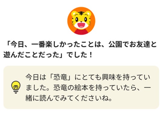 しまじろうとの「おしゃべり」や「あそび」の中で見えた「興味」や「感情」をAIが分析し、専用サイトでレポートを表示します。お子さまの成長が見えることに加え、気づかなかった興味や好きを発見し、伸ばしてあげることをサポートできます。