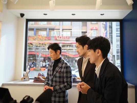 店内が報道陣に開放されると、大谷亮平さんと廣瀬俊朗さんが“お客さま第一号”として入店し、店長 服部誠の接客に熱心に耳を傾けながら、フランスの高級靴ブランド「CORTHAY(コルテ)」とコラボレーションしたシューズをはじめ、RUNWALKの歴代モデルとともにテクノロジーの変遷を紹介するコーナーや「靴の木型」ができる工程を原木を使って説明するコーナーなど、店内をじっくり見学しました。