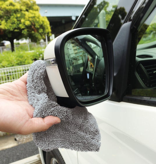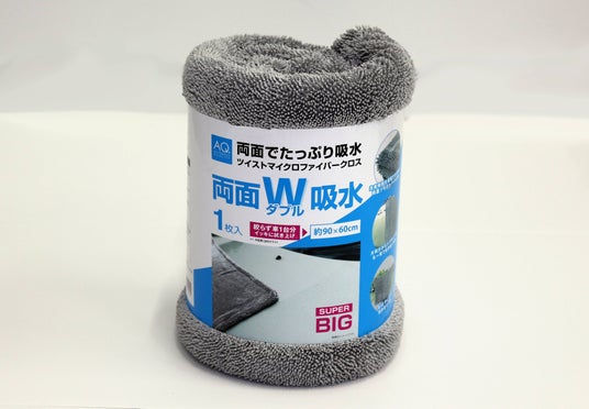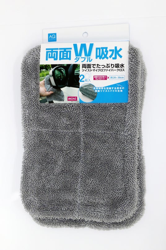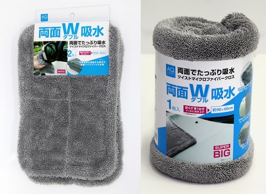 ■「AQ. 両面でたっぷり吸水ツイストマイクロファイバークロス」は、ツイスト状の生地が水滴を瞬時に吸収。ミニとスーパーBIGの2サイズ