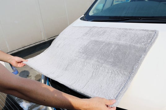 吸水性に優れたツイスト状の厚手のクロスで、瞬時に吸水。洗車後の水滴の拭きあげに最適です。従来版の片面ツイスト生地クロスから両面に改良し、給水量が大幅アップしました。サイズは、ミニと、スーパーBIGの2サイズ展開で、ミニはグリルにたまった水滴や、ドア周りなどの仕上げ拭きに最適です。スーパーBIGは、両面で中型車1台の水滴を絞らず一気に拭きとれる吸水力を有しています。