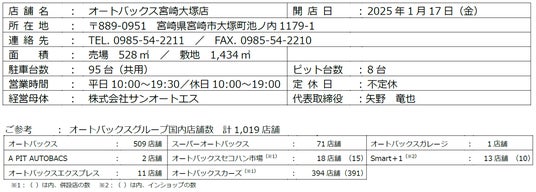 株式会社オートバックスセブン(代表取締役 社長:堀井勇吾)と加盟店契約を結んでいる株式会社サンオートエス(代表取締役:矢野竜也)は、1983年4月29日にオープンした「オートバックス宮崎大塚店」を2025年1月17日(金)にリニューアルオープンいたします。