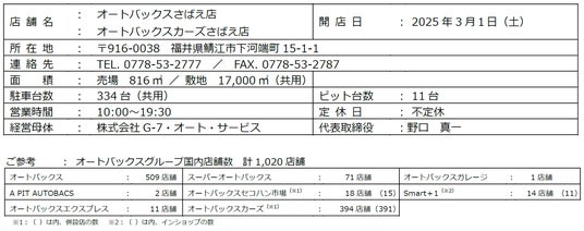 株式会社オートバックスセブン(代表取締役 社長:堀井勇吾)と加盟店契約を結んでいる株式会社G-7・オート・サービス(代表取締役:野口真一)は、2005年4月1日にオープンした「オートバックスさばえ店」を2025年3月1日(土)に移転し、リニューアルオープンいたします。