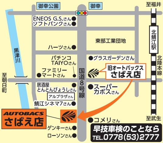 移転先は、旧店舗から南西に約0.4km、国道8号線沿いの複合施設の一角です。リニューアルに伴い、受付番号発券機や待ち時間予約システムを導入し、より便利に快適にご利用いただける店舗を目指します。また、同時に併設店の車買取・販売の「オートバックスカーズさばえ店」も移転オープンします。