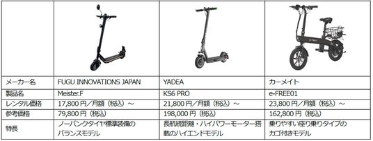 オートバックス店舗でも人気の以下3種類を取り扱い:・Meister.F(FUGU INNOVATIONS JAPAN):電動キックボード型
