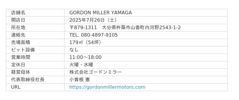 株式会社オートバックスセブン(代表取締役 社長:堀井勇吾、以下「当社」)の連結子会社である株式会社ゴードンミラー(代表取締役社長:小曽根憲)は、GORDON MILLER(以下GML)ブランドの西日本初の店舗となる「GORDON MILLER YAMAGA」を、2025年7月26日(土)に新規オープンいたします。