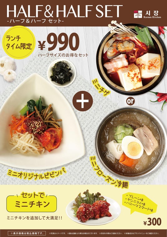 「ミニオリジナルピビンバ」と「ミニチゲ」もしくは「ミニフローズン冷麺」をお選びいただけるお得なランチセットです。