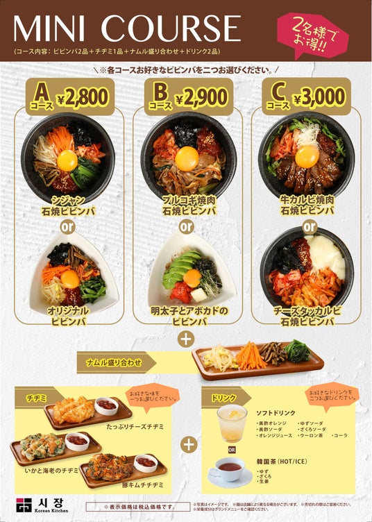 ~選べるピビンバ2品+ナムル盛合せ+選べるチヂミ1品+選べるドリンク2品のお得なセット~