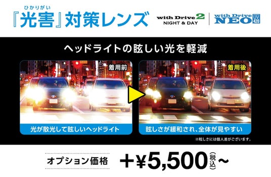メガネ・補聴器を販売する「メガネの愛眼」「Aigan」 ( https://www.aigan.co.jp/ )を運営する愛眼株式会社(本社:大阪市天王寺区、代表取締役社長:佐々 昌俊)は2024年9月24日(火)から、夜間のヘッドライトの眩しさを軽減するオプションレンズ「withDrive(ウィズドライブ)レンズシリーズ」を販売開始したことをお知らせいたします。お好みのメガネフレームに度付きでもオプション選択ができます。