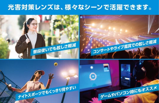 夜間運転のヘッドライト対策以外にも、コンサートやライブ会場のLED照明、ナイトスポーツ、ゲームやパソコン使用時の眩い光対策に大活躍のオールタイムレンズです。