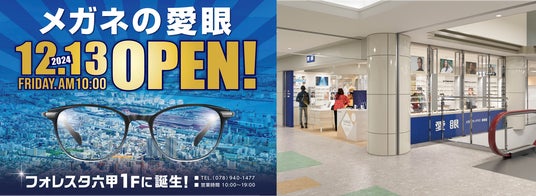 メガネ・補聴器を販売する「メガネの愛眼」「Aigan」 ( https://www.aigan.co.jp/ )を運営する愛眼株式会社(本社:大阪市天王寺区、代表取締役社長:佐々 昌俊)は、兵庫県神戸市灘区の商業施設「フォレスタ六甲」1Fに「メガネの愛眼 フォレスタ六甲店」を2024年12月13日(金)、オープンしましたことをお知らせいたします。