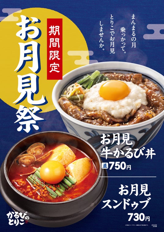 また、『かるびのとりこ』全店舗で本日より秋季限定で「お月見祭」を開催します。玉子の黄身をお月様に見立てた「お月見牛かるび丼」や「お月見スンドゥブ」は、濃厚なうまさが加わり、さらにご飯が進む商品となっています。