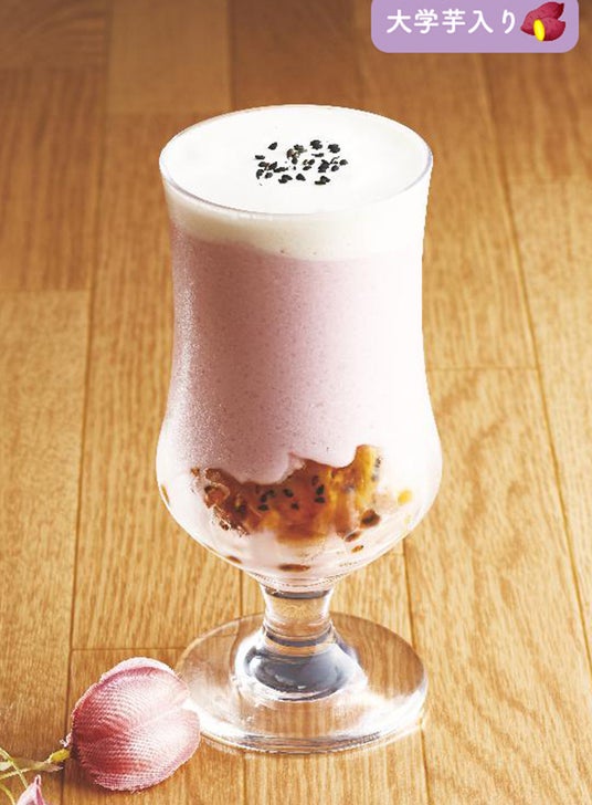 旬の紫芋を使用したドリンクをご用意しております。大学芋入りの紫芋のフラッペをはじめ、好みに合わせてホットやアイスの商品をお選びいただけます。