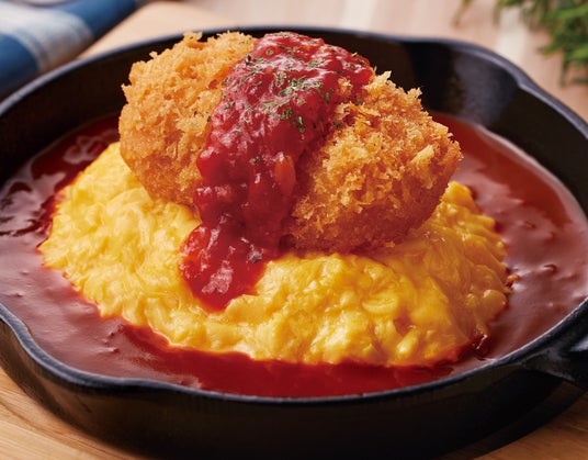 ふわとろ卵のオムライスに、かにクリームたっぷりのコロッケがトッピングされた幸せメニュー。