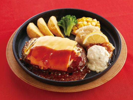 ジョイフル自慢のハンバーグにチェダーチーズをドンっ!とのせました。