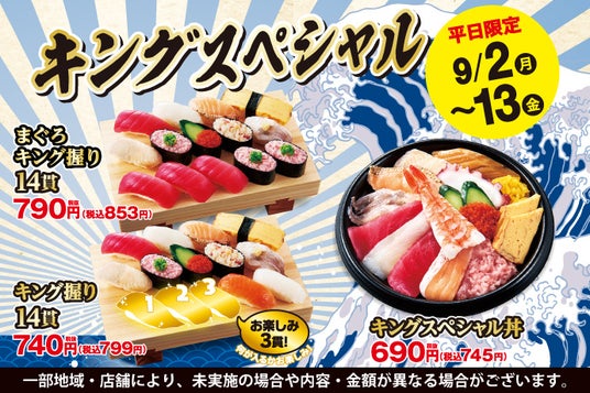 KOZOホールディングス株式会社の子会社である株式会社小僧寿しは、持ち帰りすし店「小僧寿し」にて、9月2日(月)~6日(金)、9日(月)~13日(金)の期間限定で「キングスペシャルフェア」を開催します。