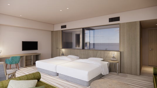 シンプルで機能的なツインルーム。壁天井いっぱいまで開放された窓が、明るく開放感ある空間を演出します。